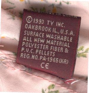 Front of clothing tag reads "© TY INC OAKBROOK, IL. USA PA. REG. # 1965 FOR AGES 3 AND UP." Clothing tag found on a second generation Shelby. |